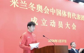 1月27日上午,第25届冬奥会中国体育代表团在京正式成立。男子钢架雪车名将殷正在成立大会上代表运动员...