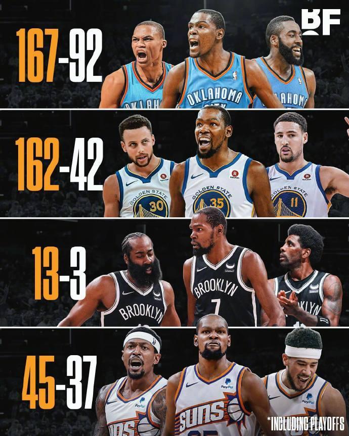 尽管如此,杜兰特太阳生涯场均还是可以得到26.8分,在得分方面还是没得说。杜兰特之前在雷霆场均也能得到27.4分,勇士生涯场均为25.8分,篮网生涯场均高达29分。这样一来,杜兰特也超越詹姆斯(3支),成为首位做到在4支球队场均得分25+的球员。
