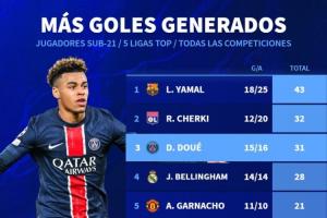 九游娱乐-五大联赛U22球员进球+助攻榜:亚马尔43次居首 杜埃31次升第三